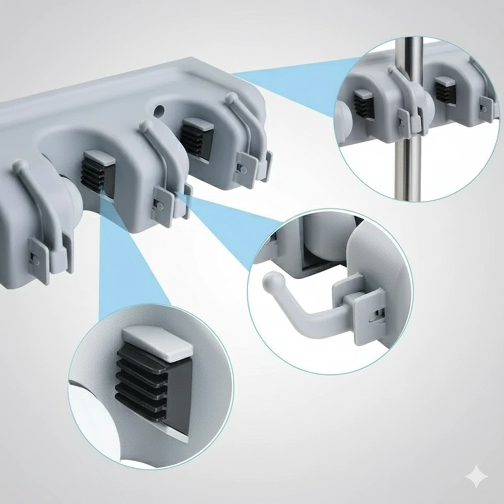 Soporta escobas, trapos, palas, cepillos y más. Ideal para optimizar cada rincón con un solo producto.